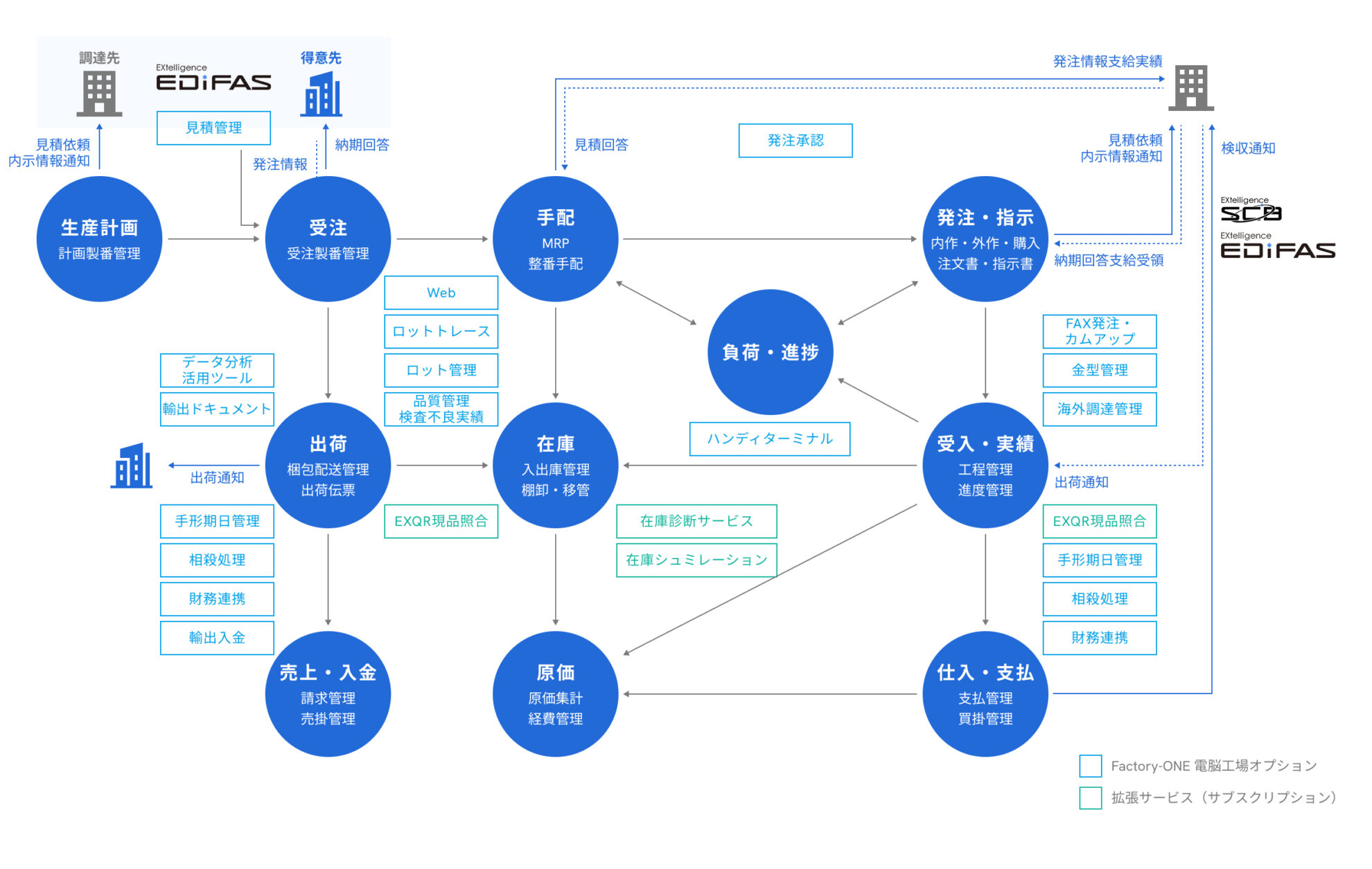 SCMやB2Bなどに対応する「つながる工場」の原点となります。電脳工場MFCには標準で連携モジュールが装備されているため、シームレスに様々なEDI情報共有が可能。