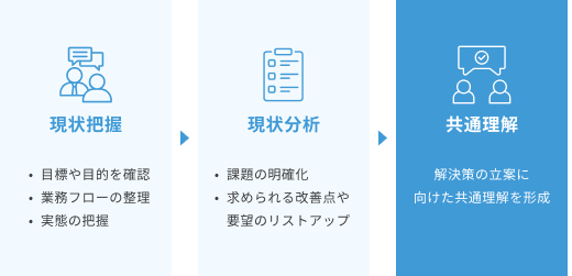 当社では、現状ヒアリングの前にお客様の経営目標やプロジェクトの目的を確認し、ヒアリングの焦点を明確化します。関係者からのインタビュー、ドキュメントレビュー、現場視察を通じて、業務フローを整理し、使用中のシステム、運用実態を把握します。収集した情報を整理・分析し、現在のシステムや業務プロセスの課題を明確化します。また、お客様が求める改善点や要望もリストアップし、現状分析の結果をレポートに纏め、解決策の立案に向けた共通理解を形成します。