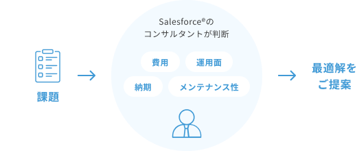 課題に応じた具体的な解決策をご提案します。特に上記表中の、②システムの機能・構造の課題、④データに関する課題については、「Salesforce® の標準機能で実現すること」、「他のサービスと連携して実現すること」、「お客様固有の要件として個別開発で実現すること」のどれが最適解かを、専門性の高いSalesforce®のコンサルタントが、スケジュールとコスト、メンテナンス性の観点で判断しご提案いたします。