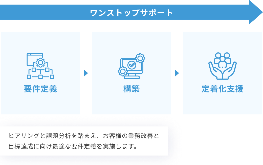ヒアリングと課題分析を踏まえ、お客様の業務改善と目標達成に向け最適なSalesforce®システムの導入を支援いたします。導入支援では、要件定義から構築、その後の定着化支援までを一貫してサポートします。要件定義から構築の期間、実際のSalesforce®の画面を操作することも可能であるため、お客様が操作性を確認しながら安心して構築を進めることが可能です。